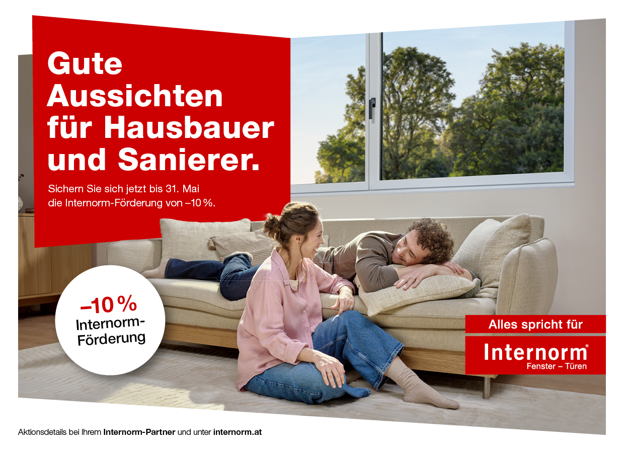 *Die Aktion gilt vom 23.03. bis 31.05.2026. Die Internorm-Förderung wird auf den Grundpreis gewährt, ist nicht mit anderen Aktionen kombinierbar und ausschließlich in Österreich gültig. Ausgenommen sind lose Glasbestellungen, Zubehör, Aktionshaustüren sowie Türen der Serie HT. Gültig für Bestellungen innerhalb des Aktionszeitraums und nur für private Endkunden.